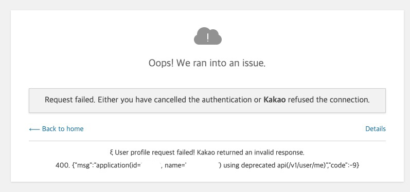 | ξ User profile request failed! Kakao returned an invalid response. 400. {"msg":"application(id=, name='') using deprecated api(/v1/user/me)","code":-9} |