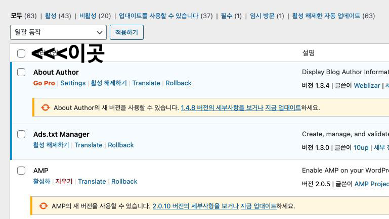 위와 같이 전체 플러그인을 선택할 수 있는 박스를 선택 후 "일괄동작"에서 "비활성화"를 선택해주면 플러그인이 모두 비활성화 처리가 되며, 하나씩 활성화 하면서 웹사이트의 특정 문제를 확인해 보고, 특정 플러그인이 활성화 되었을 때 오류가 발생되면 그 플러그인을 삭제하거나 재설치 해야 합니다.