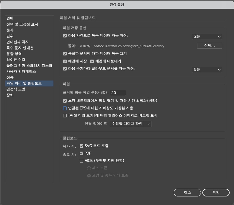 일반적으로 일러스트레이터 기준으로 '환경 설정'에 들어가서 '파일 처리 및 클립보드'를 클릭한다.