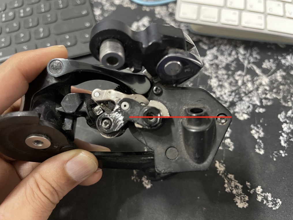 위의 사진은 변속을 할 때 가장 작은 스프라켓 만큼 변속을 눌렀을 때 모터의 모양이다. 거의 바디와 함께 수평인 것을 볼 수 있다. 처음에는 이게 문제인지 몰랐으나 빨간선 아래로 더이상 모터가 내려가지 않는데, 이렇게 되면 가장 작은 2개의 스프라켓으로 내려가지 않는 현상이 나타났다.
