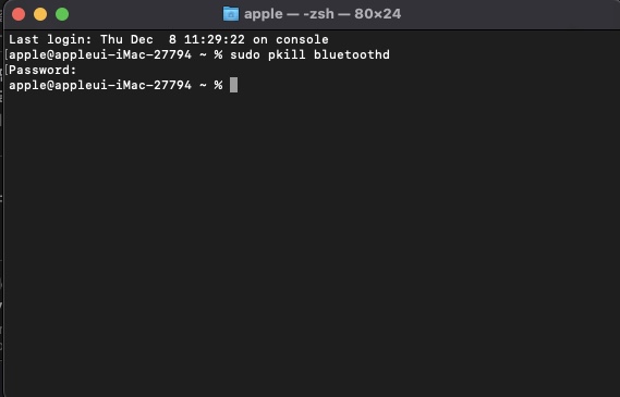 3. 터미널 창에 "sudo pkill bluetoothd" 명령어를 입력한 후 시스템 비밀번호를 입력한다.