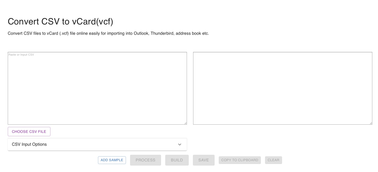 먼저 온라인에서 CSV를 VCF로 간단히 변환할 수 있는 사이트가 있다. 주소는 https://www.textcompare.org/csv/csv-to-vcard/ 이다. 이 사이트에 들어가면 아래와 같은 화면이 나온다.