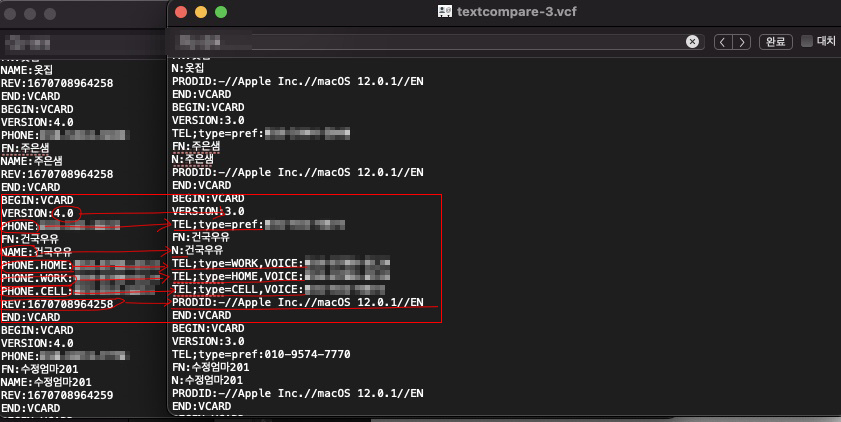 즉, '4.0'을 검색해서 '3.0'으로 모두 대치를 누르고, 'PHONE:'를 검색해서 'TEL;type=pref:' 모두 대치를 누르면 vcf 내 모든 문자들이 변경된다. 그러고 저장한다.