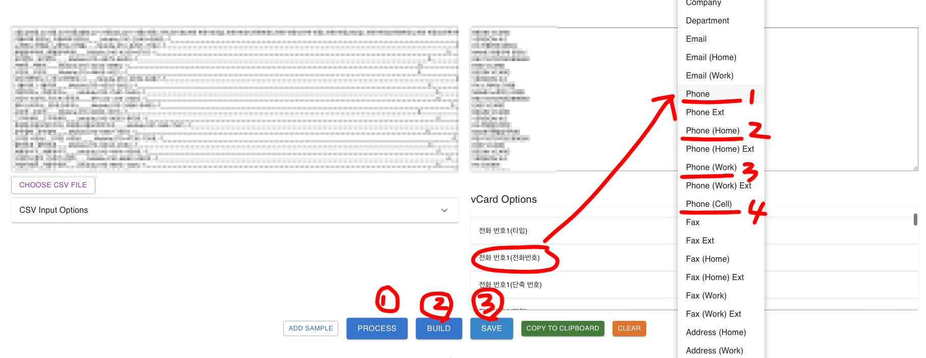 좌측의 CSV 파일이 우측 VCF로 배열을 정해야 하는데, CSV의 문자열이 우측 하단에 나타나고 그것을 VCF에 맞는 문자로 선택해서 지정해주어야 한다.