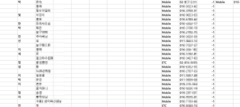 먼저 이 작업을 하기에 앞서 만약 갤럭시 연락를 등록했을 때 '성'과 '이름'을 분리해서 기록하였다면 이 둘을 엑셀에서 합쳐주는 작업을 해야 한다. CSV 파일을 엑셀로 열어보자.