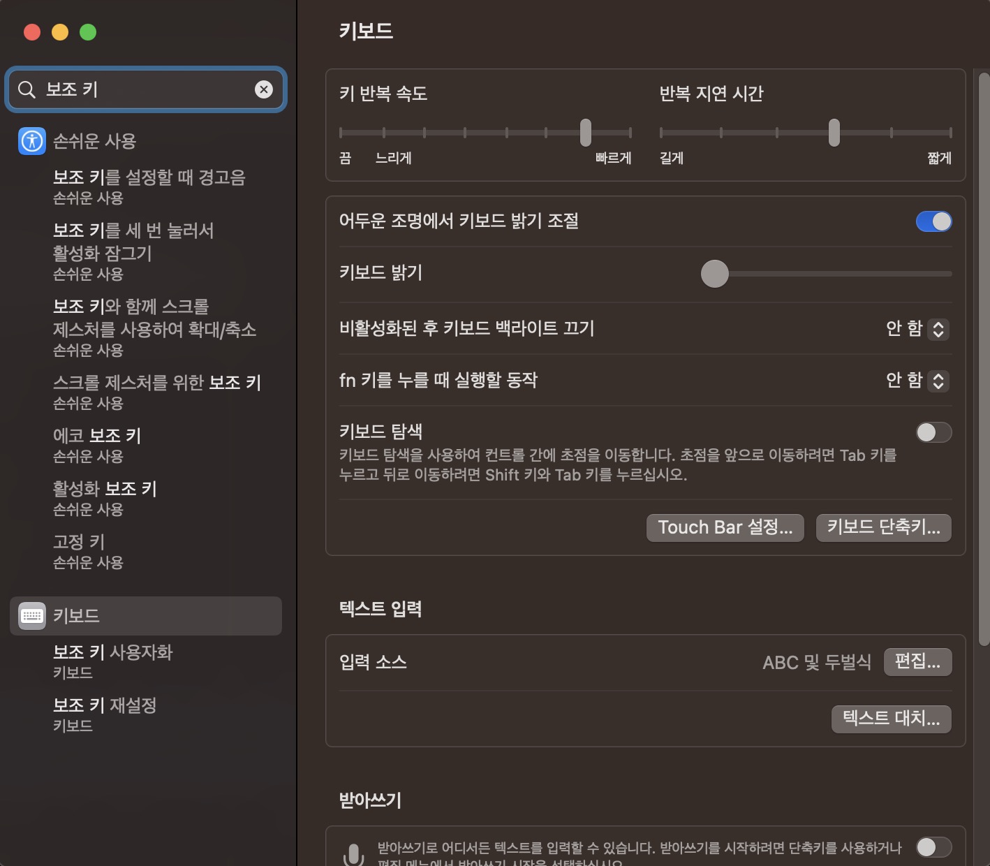 먼저 설정으로 들어가서 검색창에 위와 같이 '보조 키'라고 입력하면 하단에 키보드 '보조 키 사용자화'라는 메뉴가 보일 것이다. 그것을 클릭한다.