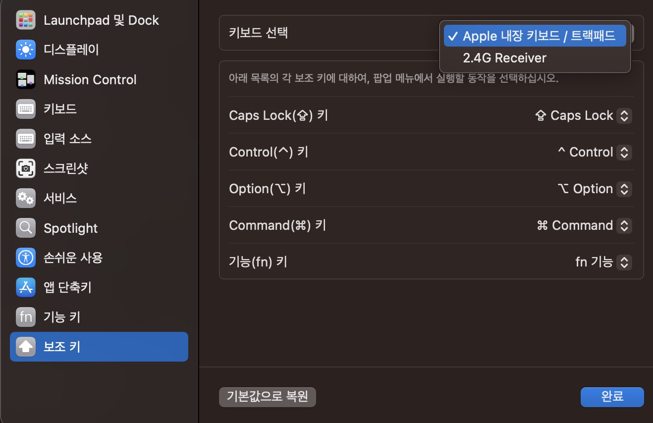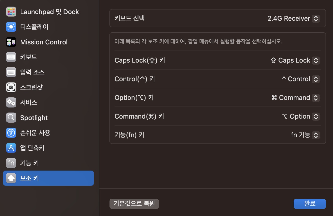 그리고 Option 키를 Command 키로 바꾸로, Command 키를 Option 으로 변경 후 '완료' 버튼을 누르면 이제 맥용 키보드와 동일한 배열로 윈도우용 키보드를 사용할 수 있다.