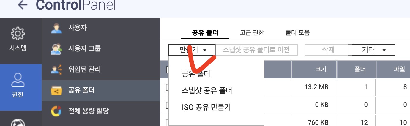 '공유 폴더' 만들기 버튼을 누른다.