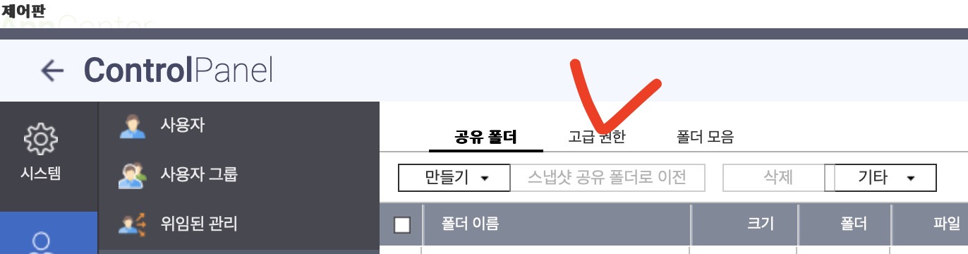 조금 전에 생성한 공유폴더 목록에서 우측 두번째 '권한설정' 아이콘을 클릭