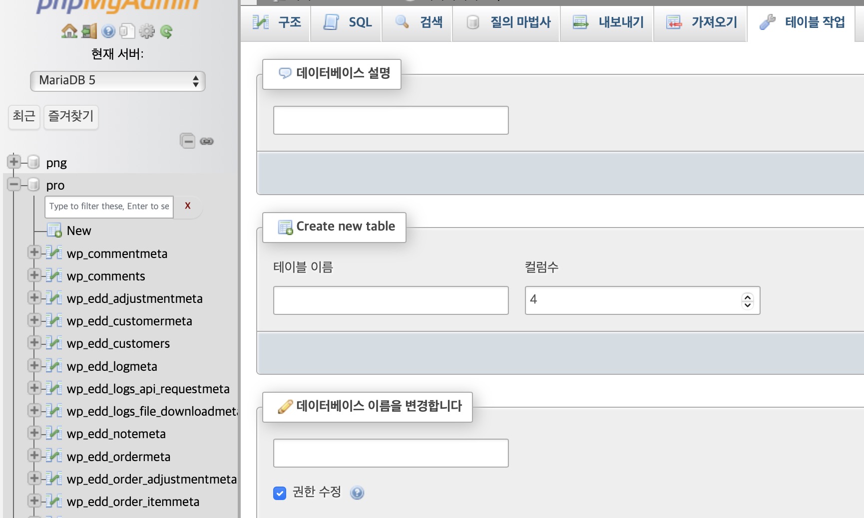 다만, 공유폴더에서 생성한 폴더이름이 실제 데이터베이스 이름과 다르게 표기되는 경우가 간혹있다. 이러한 경우 phpmyadmin에 가서 추가로 사용하고자 하는 데이터베이스 이름으로 수정하며, 데이터베이스는 물론, mariadb/data 폴더속 데이터베이스 폴더 이름도 변경되어 있다.