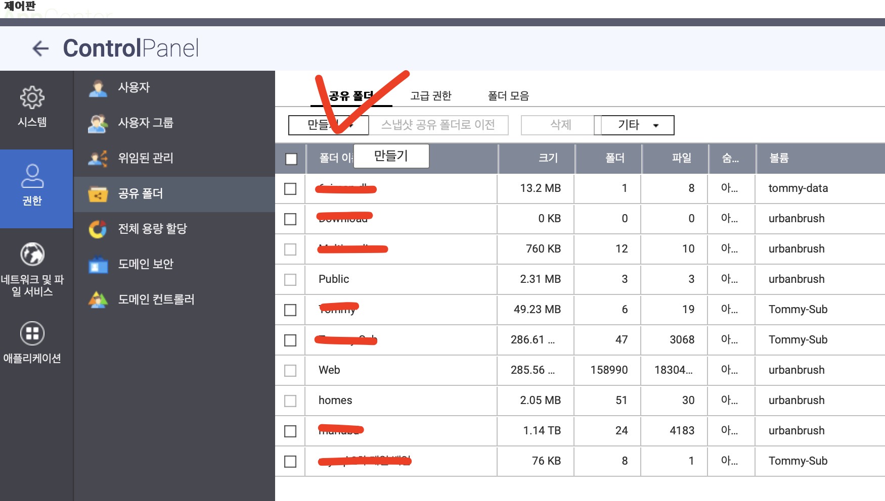제어판-권한-공유폴더로 가서 '만들기' 버튼을 누른다.