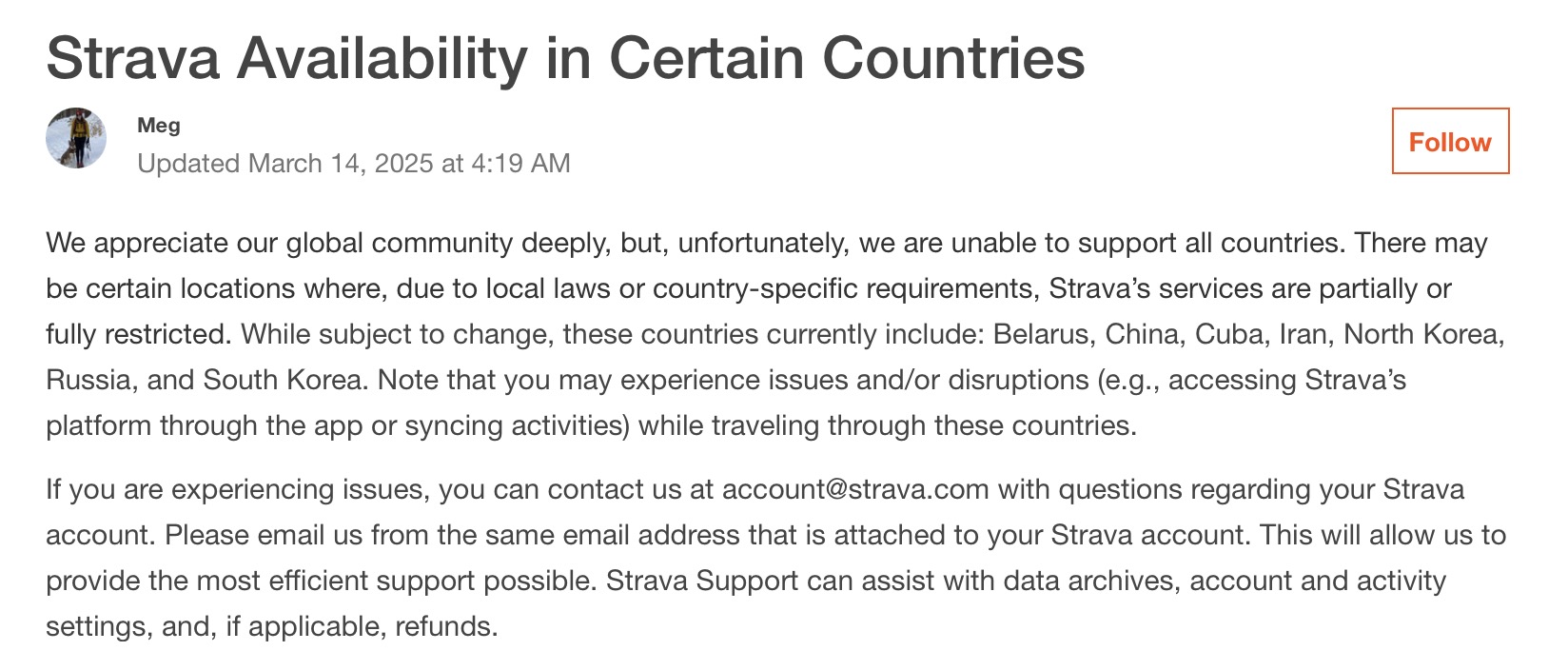 스트라바는 몇개의 국가를 상대로 해당 국가의 요청 및 법률적인 문제로 서비스가 제한된다는 점을 안내하고 있으며, 실제로 한국 앱스토어나 플레이스토어에 스트라바 어플이 검색되지 않는 것을 볼 수 있다.
