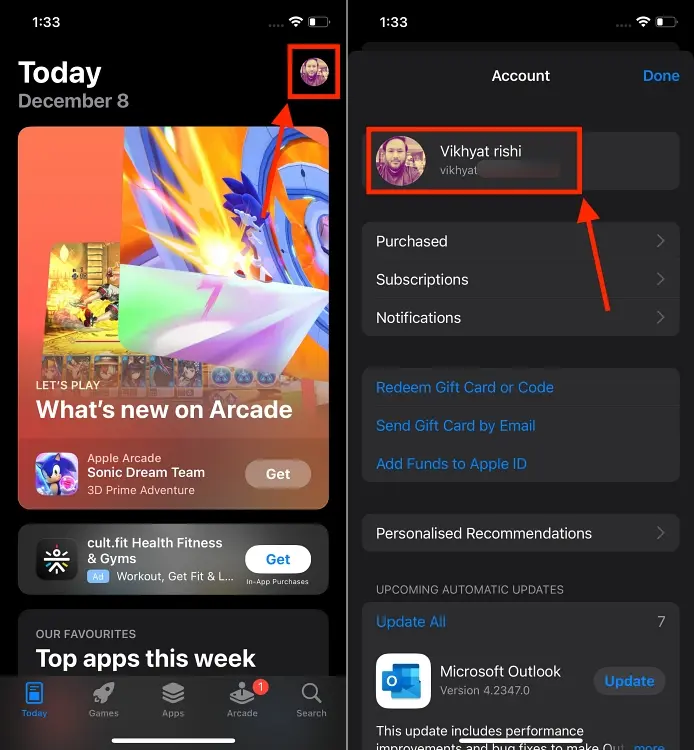 1) 앱스토어에서 프로필을 선택후 자신의 계정 이름을 선택한다.