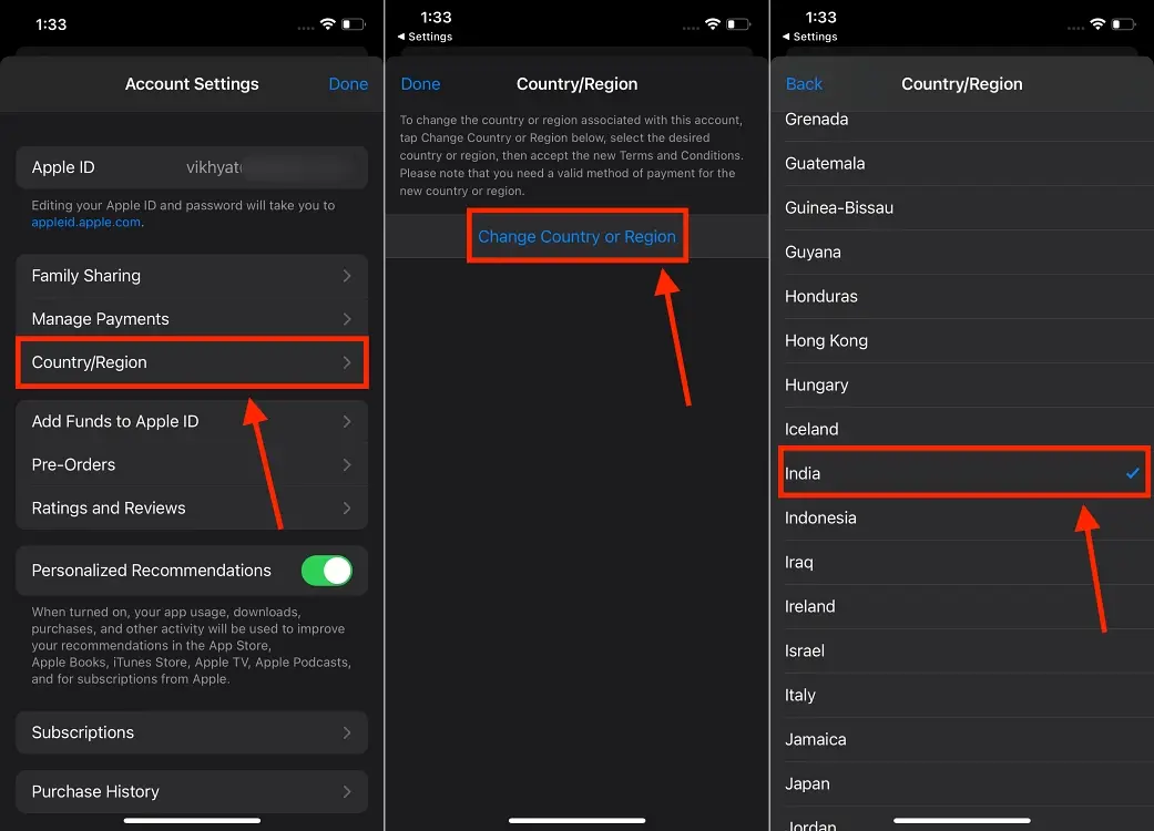 2) 계정 설정에서 '국가/지역' 항목을 클릭하고 '국가 또는 지역 변경' 항목을 클릭, 이후 국가를 미국으로 한다.(사진은 인도이지만 미국으로 하는 것을 추천)